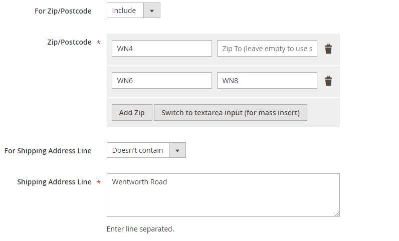 For Zip/Postcode - just as in the previous option, Include or Exclude necessary Zip/Postcodes if needed. For example, you can specify a zip code that starts from ‘X’ or ends with ‘Y. Use a single postcode or a number of zip codes From - To.