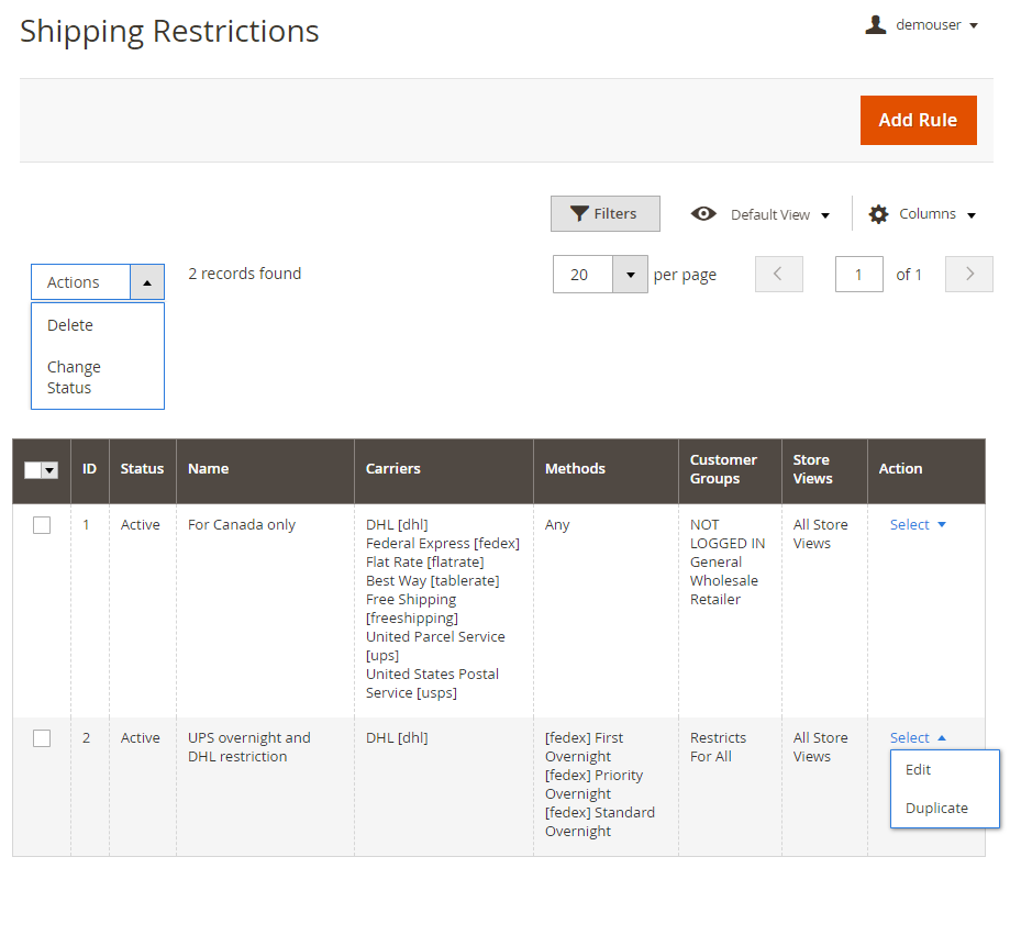 Manage all the created shipping restriction rules right on the grid. Edit them or Duplicate in the Action column.