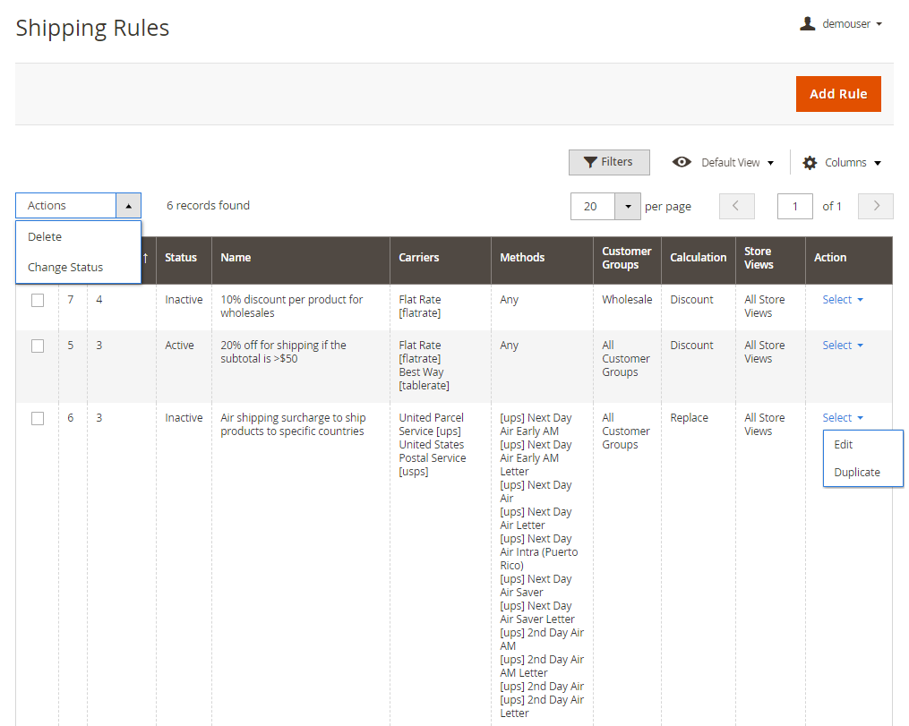 Manage all the created shipping rules right on the grid. Edit them or Duplicate in the Action column.