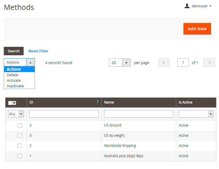 You can both create a new shipping method or correct the existing ones. To edit the already created shipping method, just click on it in the table. Delete, Activate or Inactivate methods in the Actions dropdown menu.