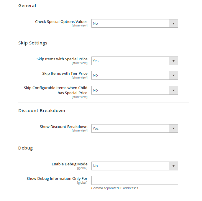 Skip Items with Special Price - Set this option to ‘Yes’, if you don't want to apply coupons and shopping cart price rules to the products with a special price.