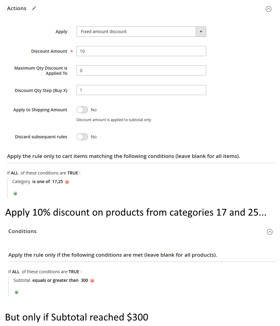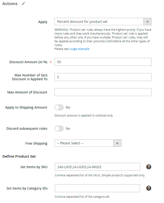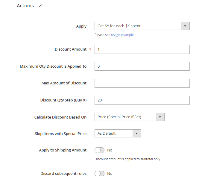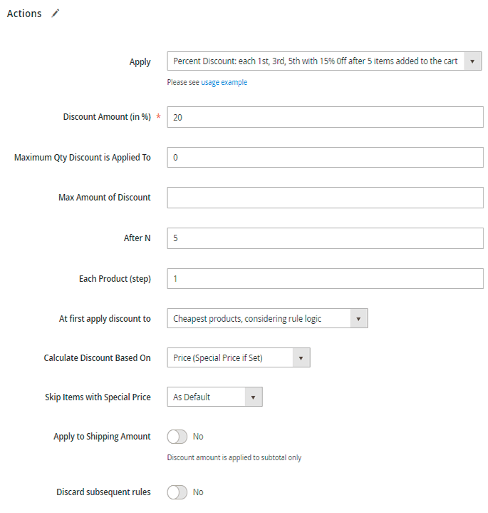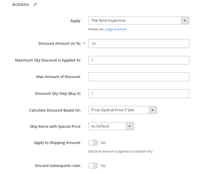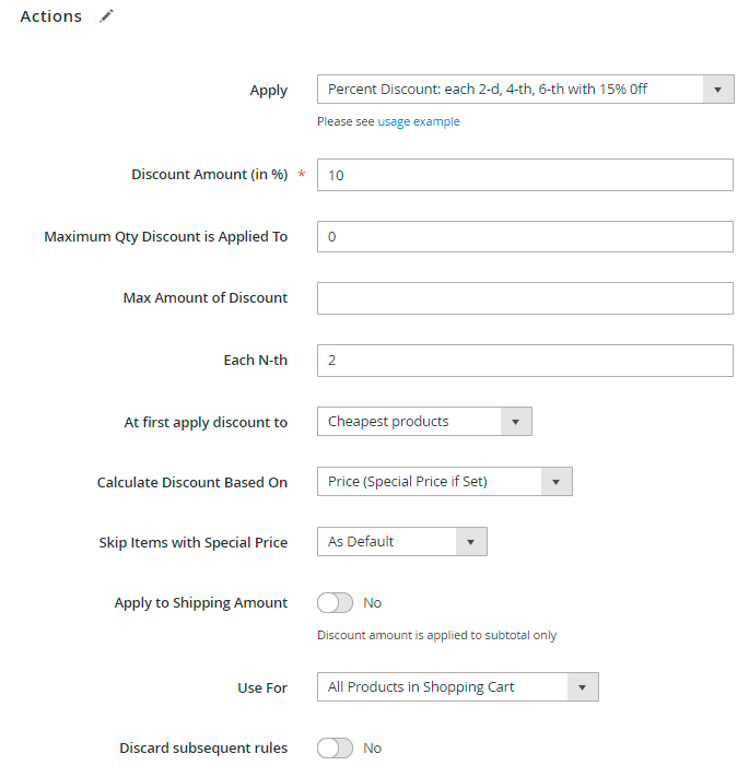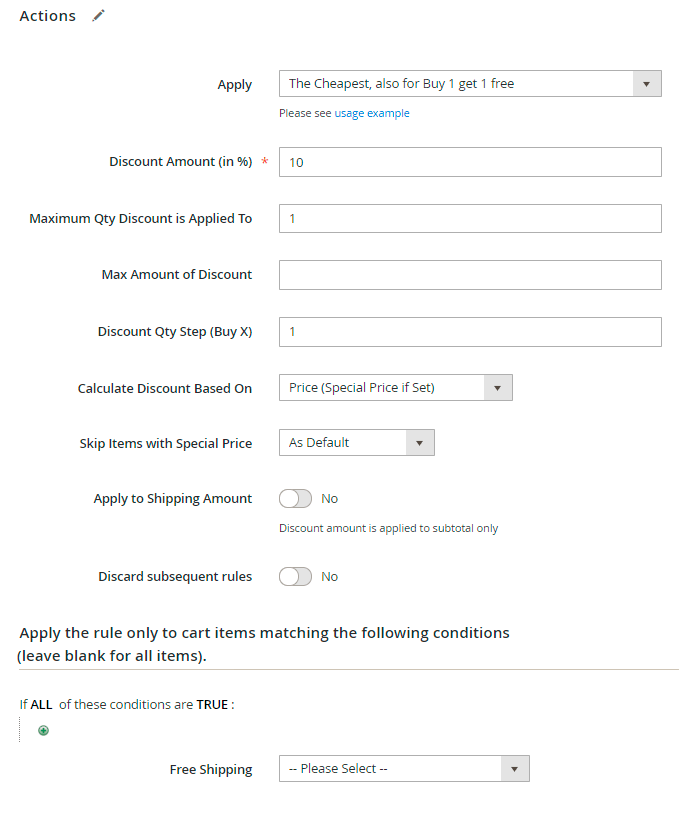 Apply to Shipping Amount - enabled this option only if you want to apply the discount to the sum of the Subtotal + the Shipping Rate. We don't need this for our promotions, so we set to 'No'.