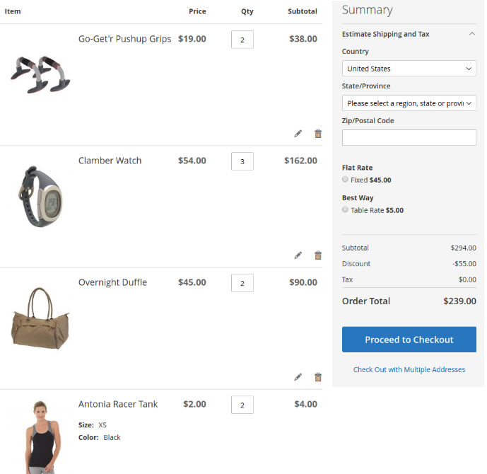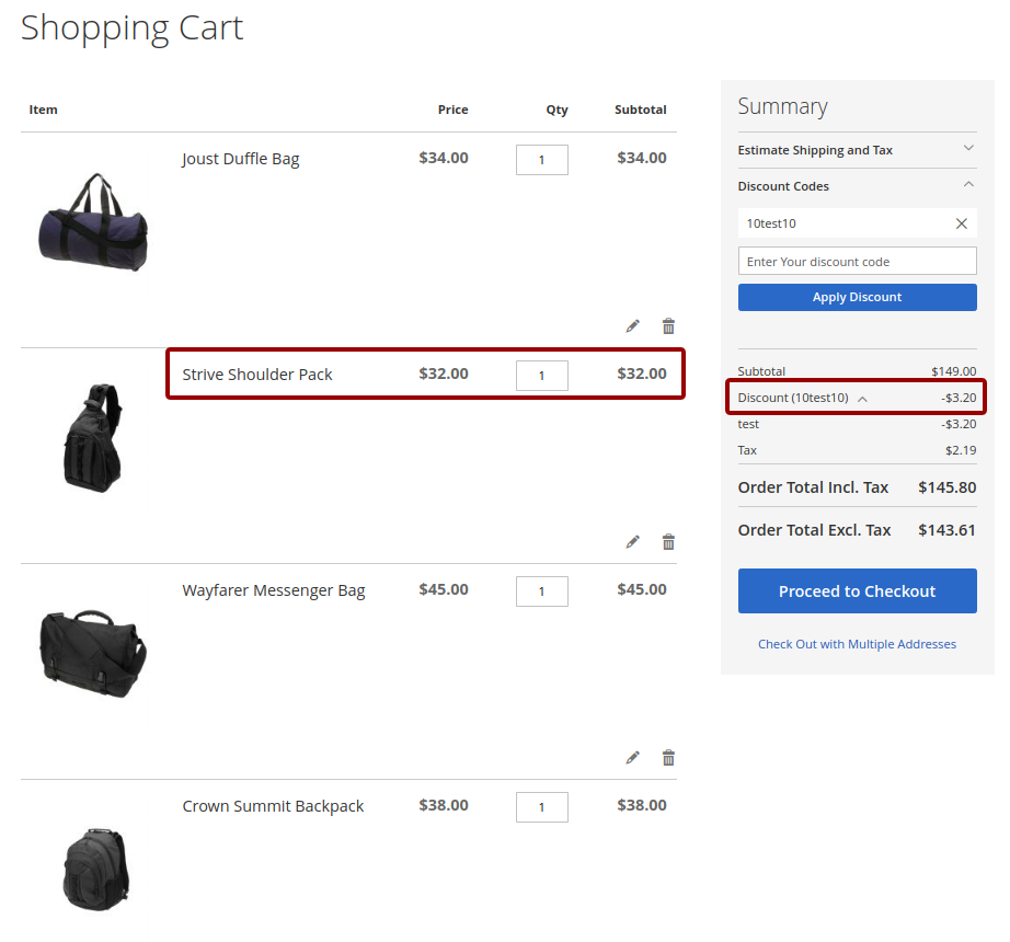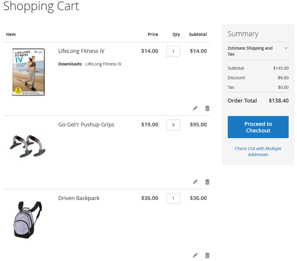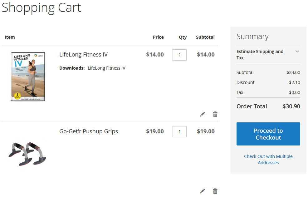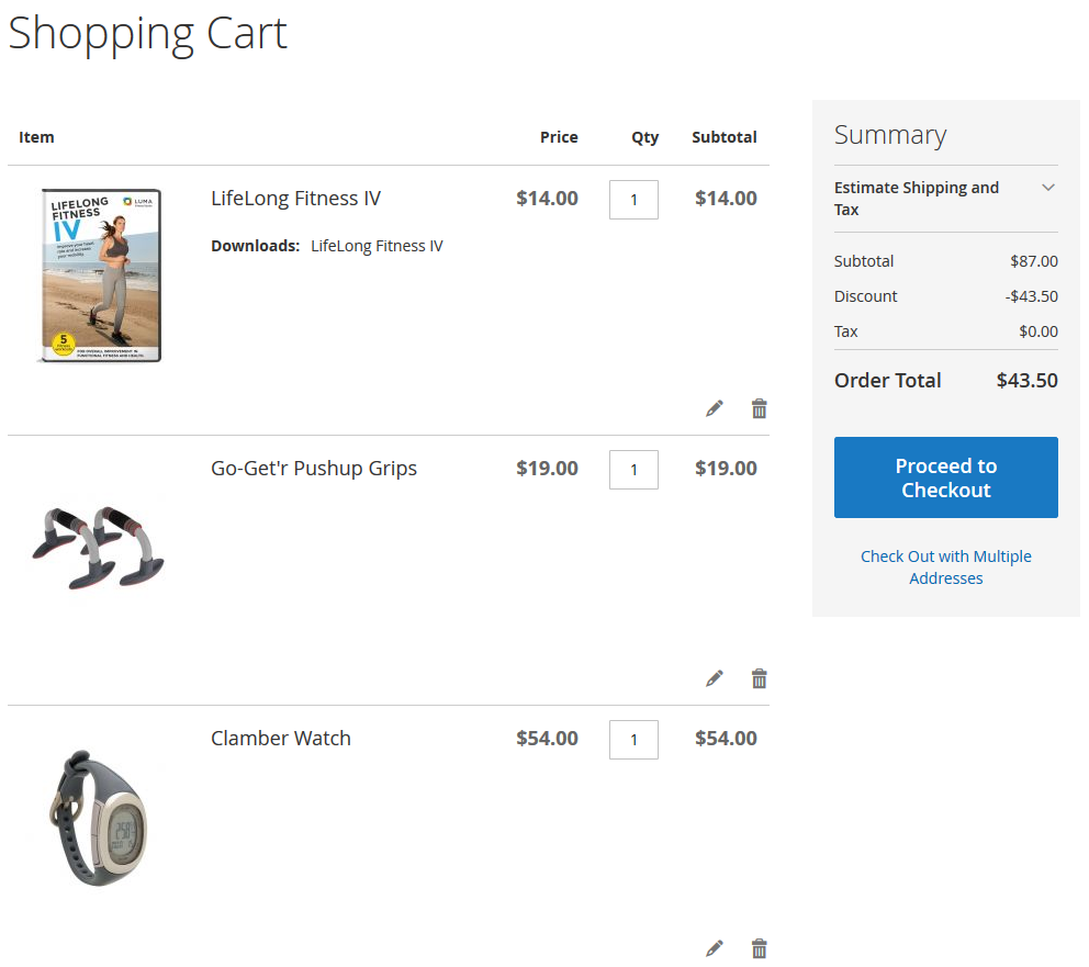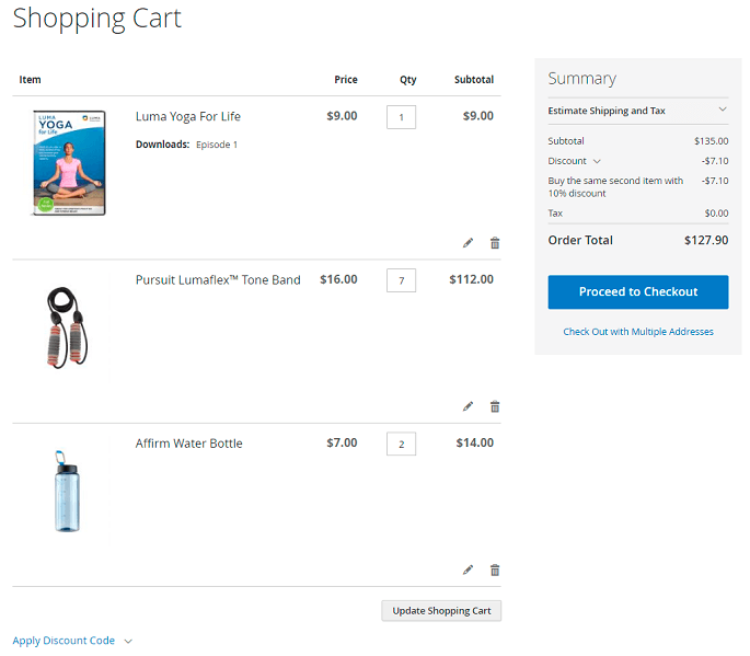At first discount will be applied to the second item of Affirm Water Bottle and will constitute $0.7. Then, the discount will be applied to each second item of Pursuit Lumaflex™ Tone Band products. The discount amount equals to $4,8 (3 * $1,6 = $4.8). To the Luma Yoga For Life product, the discount won’t be applied as the cart contains only one item of a kind. The total discount amount is $5.50.