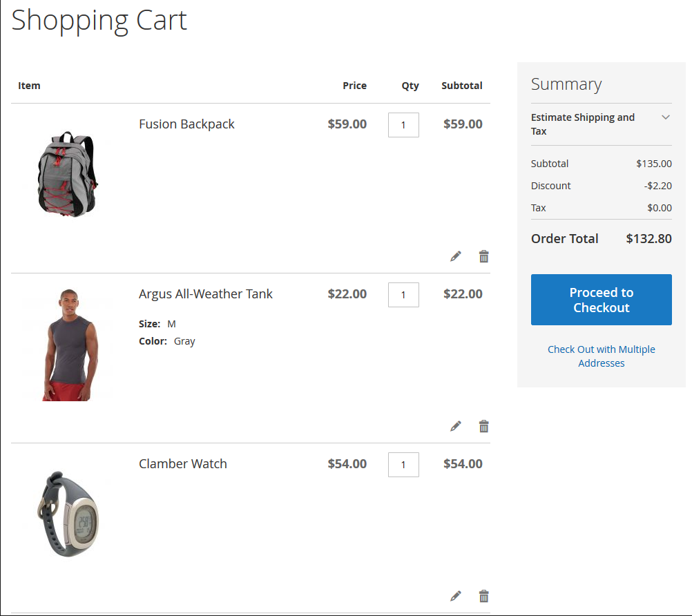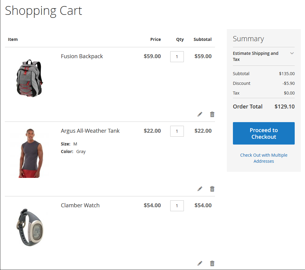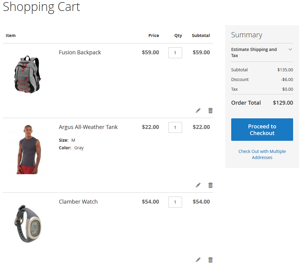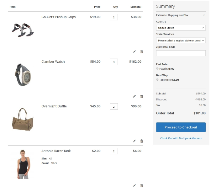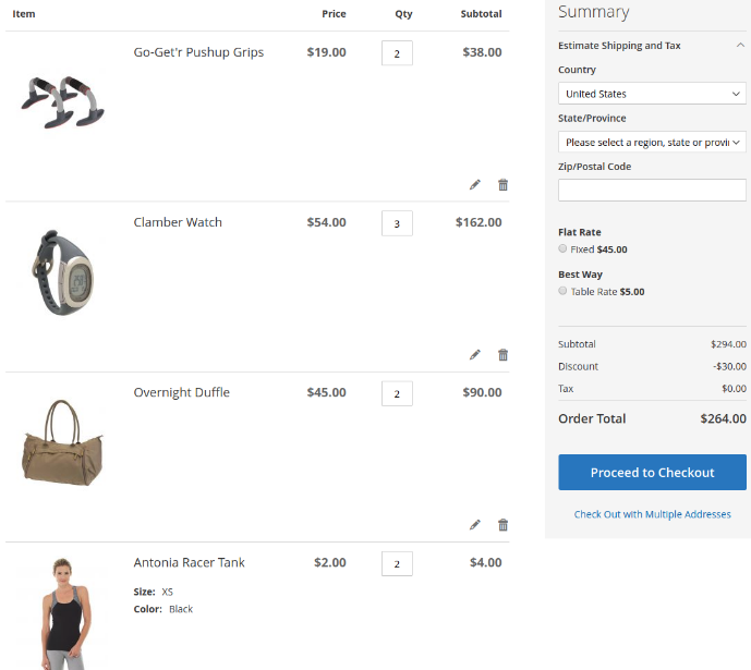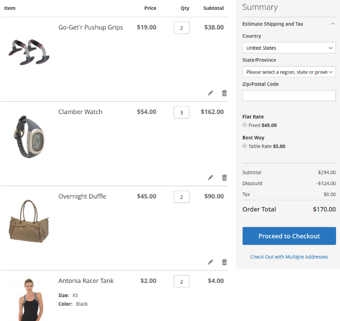 At first discount will be applied to the second item of Affirm Water Bottle and will constitute $0.7. Then, the discount will be applied to each second item of Pursuit Lumaflex™ Tone Band products. The discount amount equals to $4,8 (3 * $1,6 = $4.8). To the Luma Yoga For Life product, the discount won’t be applied as the cart contains only one item of a kind. The total discount amount is $5.50.
