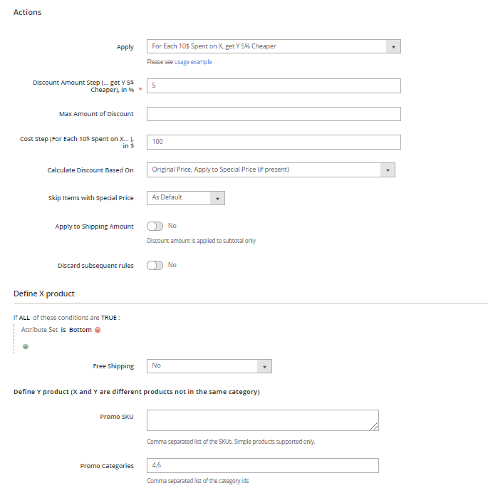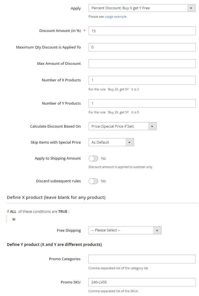 Also please note Number of X Products and Number of Y Products fields. In my example we have 'one for one' logic, but if you want to, for example, give discount like Buy 5 X and get 2 Y then 'Number of X Products' should be set to '5' and 'Number of Y Products' to '2'.