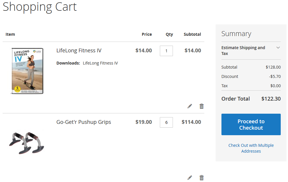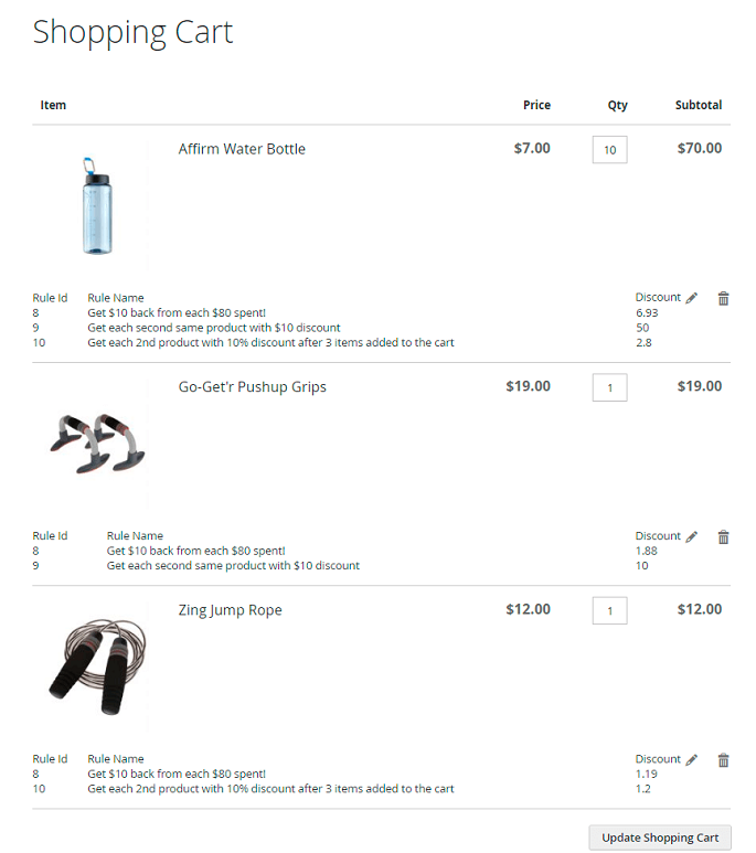 Note, that the discount will be applied to each second item in the cart - the Use For field is set to All Products in Shopping Cart. Since Each N-th setting was set to '2' and quantity of ' LifeLong Fitness IV' is lower than that value, then the discount can't be applied to this item. But we have 6 Pushup Grips in the cart. 6/2=3, so we can apply the discount to three Pushup Grips items. Price of 1 item is $19, 10% of $19 will be $1.9. Multiply $1.9 by 3 and we get $5.7 total discount. Match!
