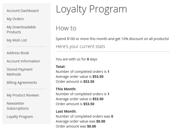 Loyalty Program for Magento 2 extension has all the features from both Special Promotions for Magento 2 and Special Promotions Pro for Magento 2 modules but also adds a page to a customer account where you can display information about the loyalty program you run on your store with goals, levels and discounts for each level along with the purchase history overview.