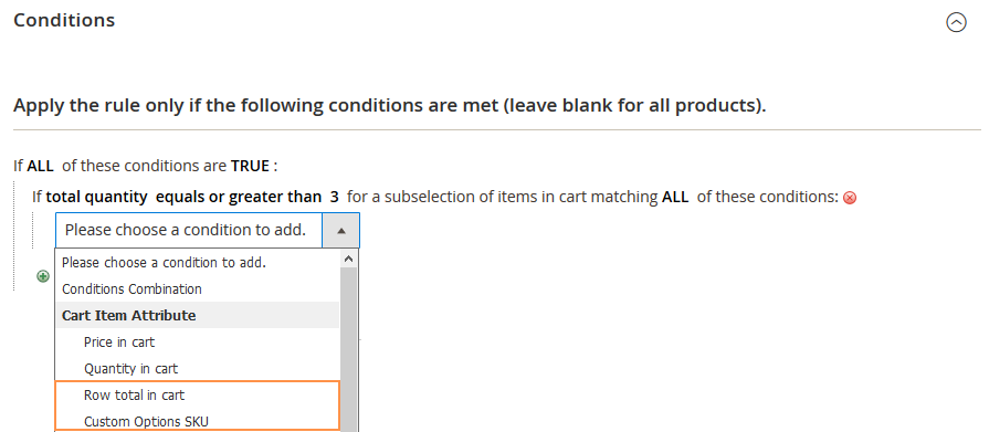 Check Special Options Values - If the option is set to 'Yes' the custom options for the rule conditions will be enabled. Thus, you can use the ‘Custom option SKU’ condition, for example, to trigger a discount rule only when a particular Special Option was selected for a product. See the example of custom options below.