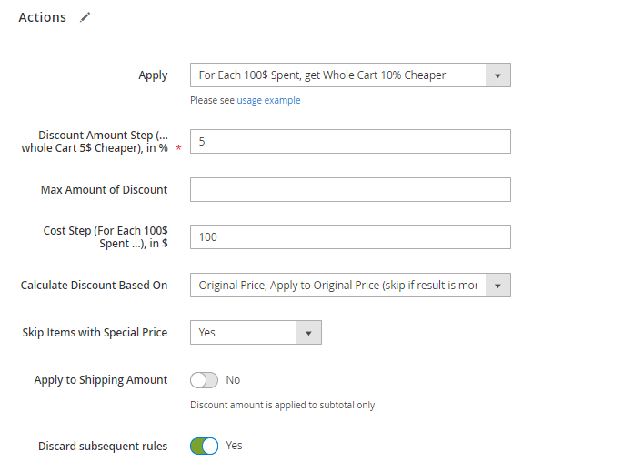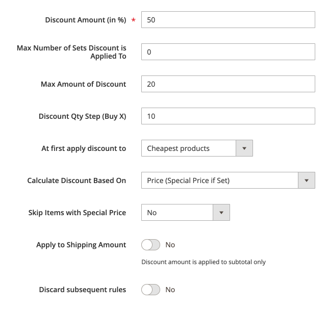 Max Amount of Discount - set the maximum discount amount that can be applied to one rule. It means that no matter how you configured the previous settings, the final discount can be more than you specify here. In our case, we'll not set any limitations.