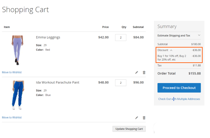The Cart subtotal is $180. In total, we have 4 items in the cart. According to our conditions, the discount for the 4th position is 20%, and the 20% discount from $180 is $36.