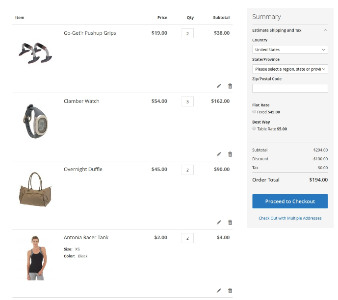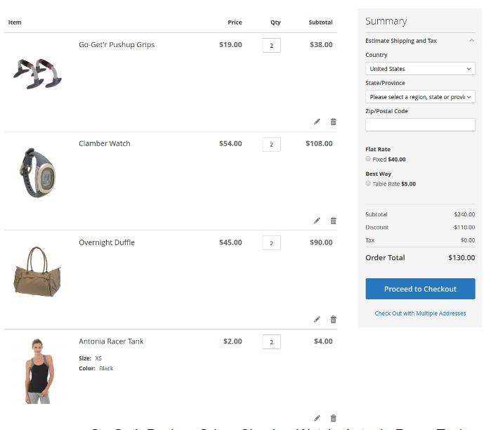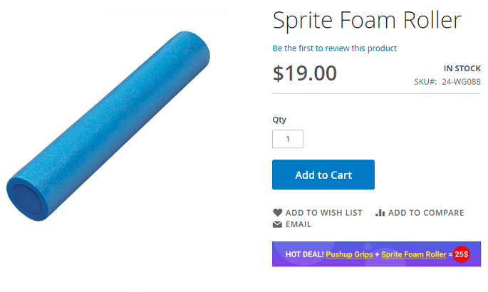 We created a promo rule, that offers a set for $20. The set is comprised of the following items. Go-Get'r Pushup Grips, Clamber Watch and Antonia Racer Tank.