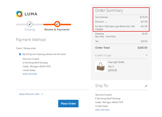 Let’s compare the result with the one we can obtain by applying the discount for all products in the cart.