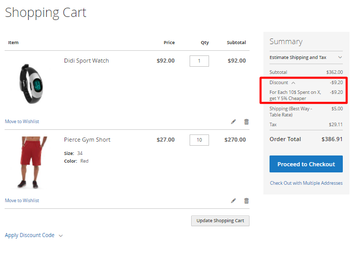 For the products we've chosen in the previous example, discount amount will constitute $7.10 ($0,7 + $1,6 * 4 = $7.10):