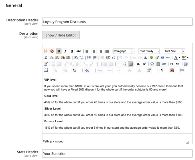 Enabling the Customer Account feature will allow you to add a description of your loyalty program. You can use simple HTML tags to style the text in the Description field.