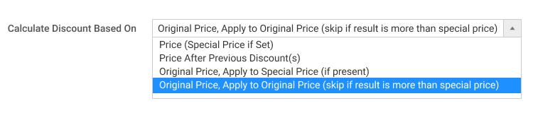 Original Price, Apply to Original Price (skip if result is more than special price) - the algorithm compares Special Price with Final Price after discount and chooses the value you need depending on module configuration. This option is helpful when it is required to limit discounts in case discounts from several sources apply to the same item. This way, you don't need to check each and every possible discount source for overlaps and don't spend excessive amounts of money on promo discounts.