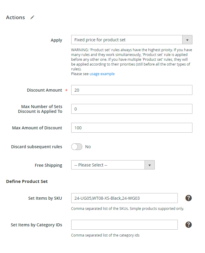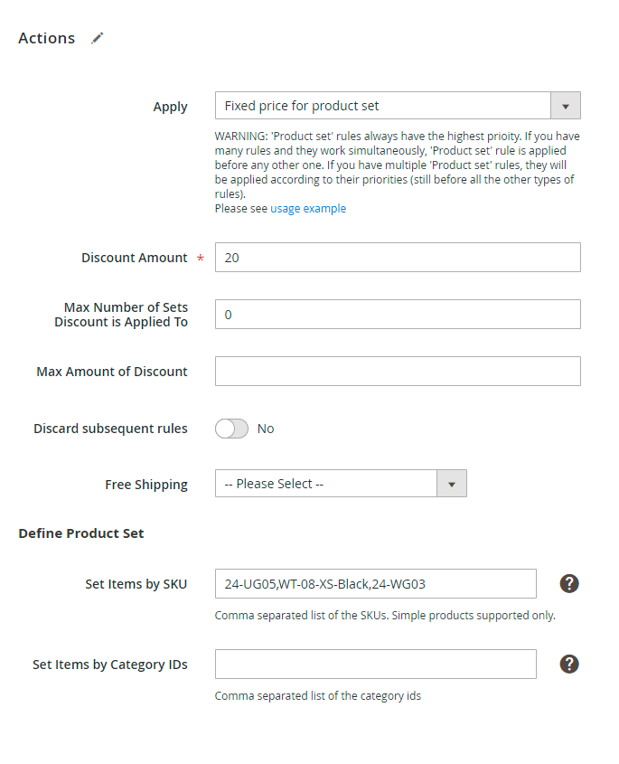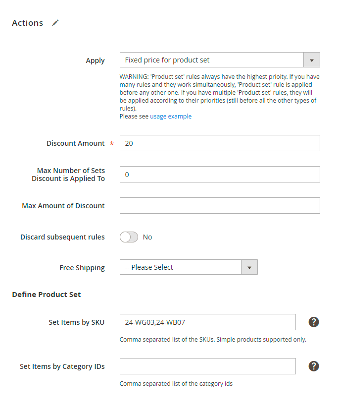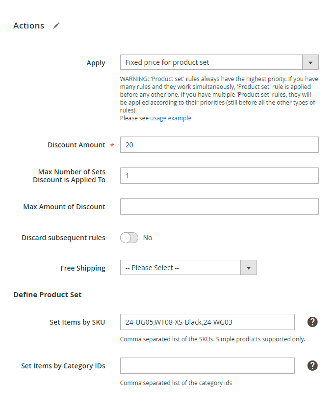 This action works exactly the same as Percent discount for product set above, but it will give a fixed amount of discount instead of percent discount.