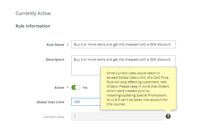 For example, you want to organize a give away with a 50% discount for the first 100 customers who would use your prom coupon. In order to set such a limitation please navigate to Marketing → Cart Price Rules and then add new rule or edit existing.