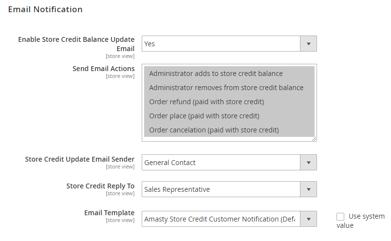 Enable Store Credit Balance Update Email - choose Yes to enable automatic notifications about the updates in customers’ store credit balance.