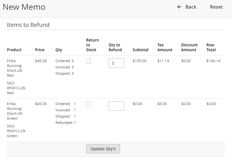 With the extension you are able to return items to stock if needed and change items quantity to refund in the Qty to Refund section. Click Update Qty’s to see the current subtotal.
