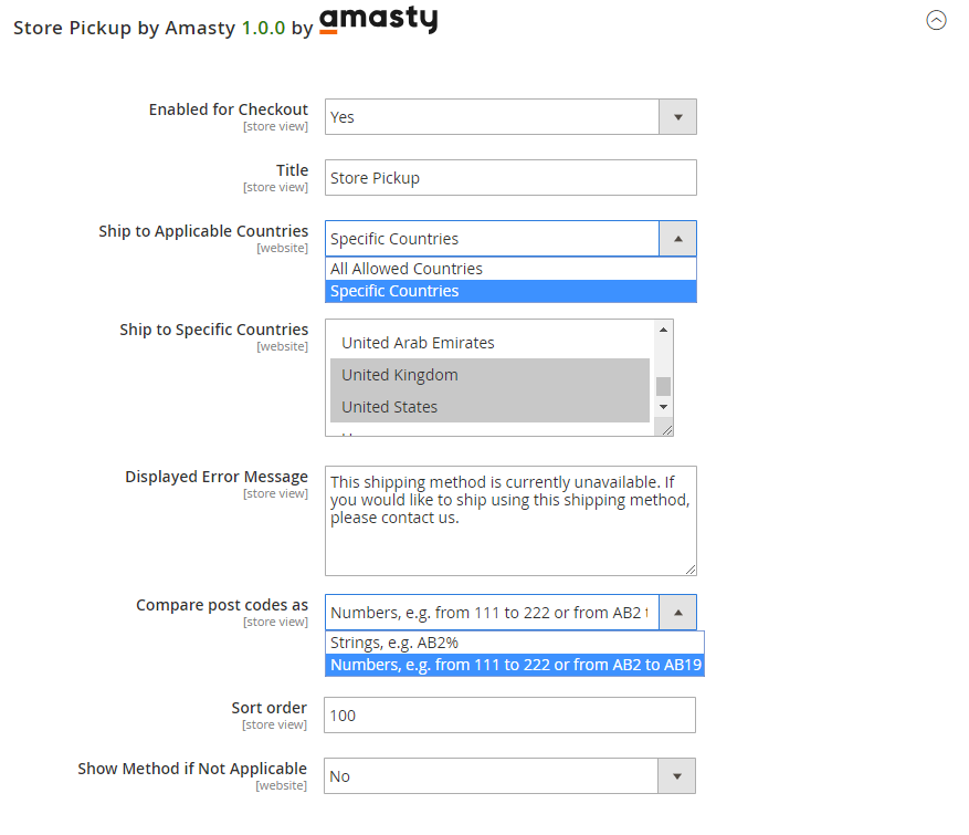 Ship to Applicable Countries - set to All Allowed Countries if you want to offer store pickup method for customers from all countries. If no, choose the Specific Countries option in this tab.