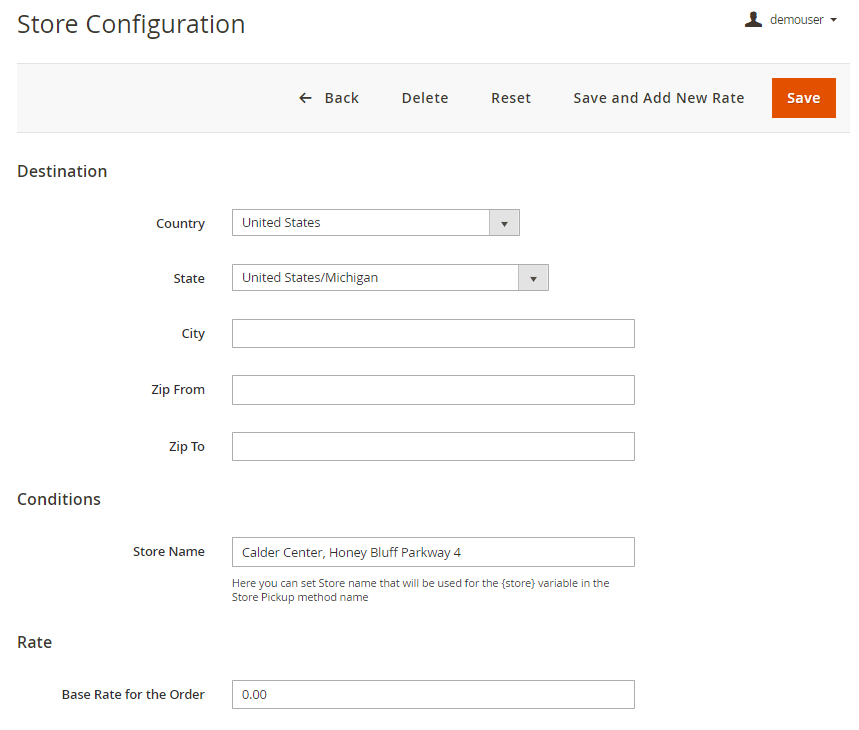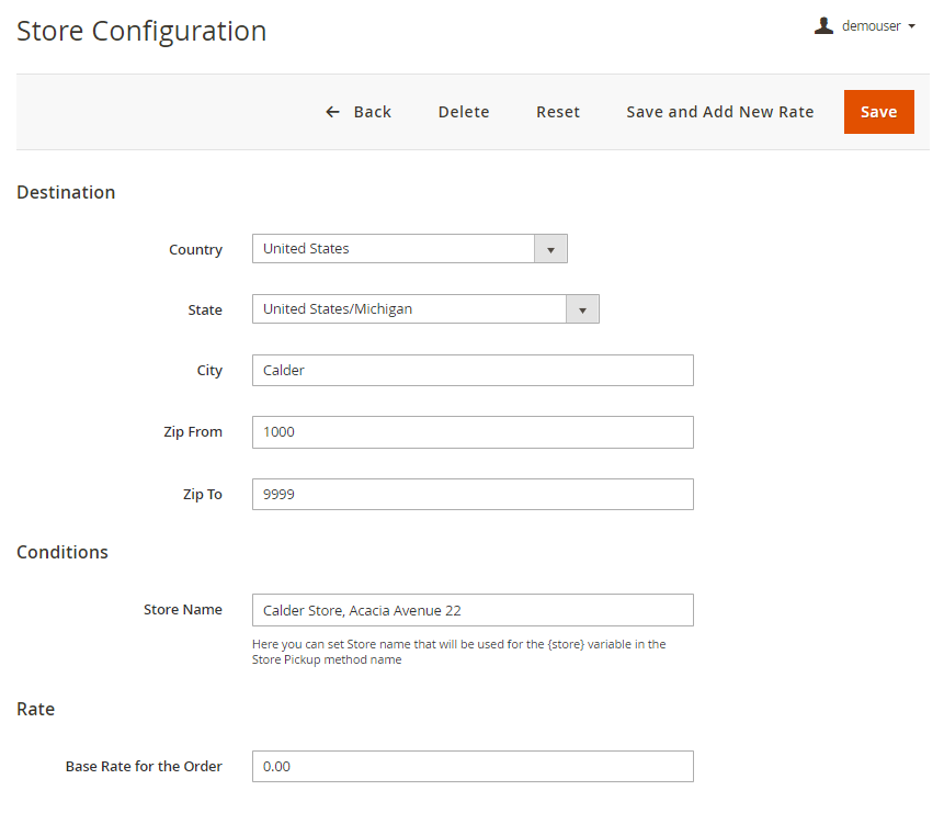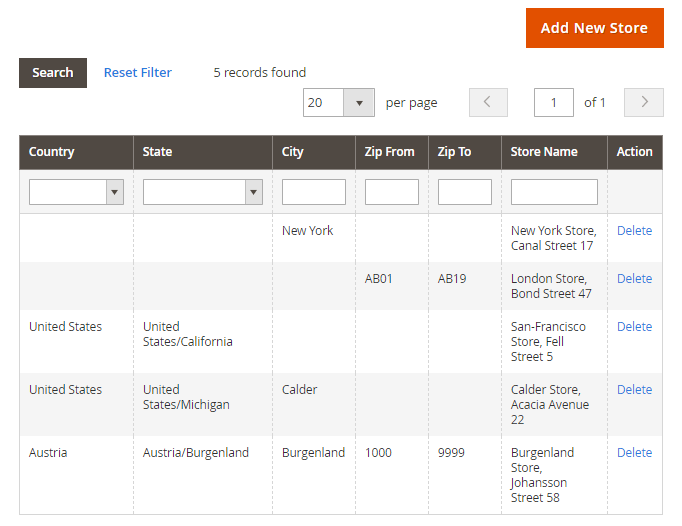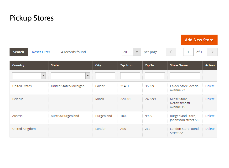 To display the pickup point relevant to the customer’s address, make sure that the conditions of different stores do not overlap with each other, otherwise, only one store will be displayed on the frontend. If you have several stores in the same city/country, you may leave some fields empty.