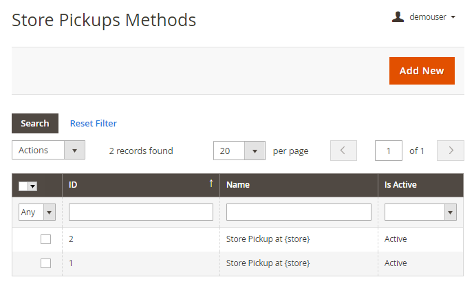 For example, we have two stores in Calder and want to let customers choose the store to pick up from. So we create a new shipping method via the Add New button in the Amasty → Store Pickup tab.