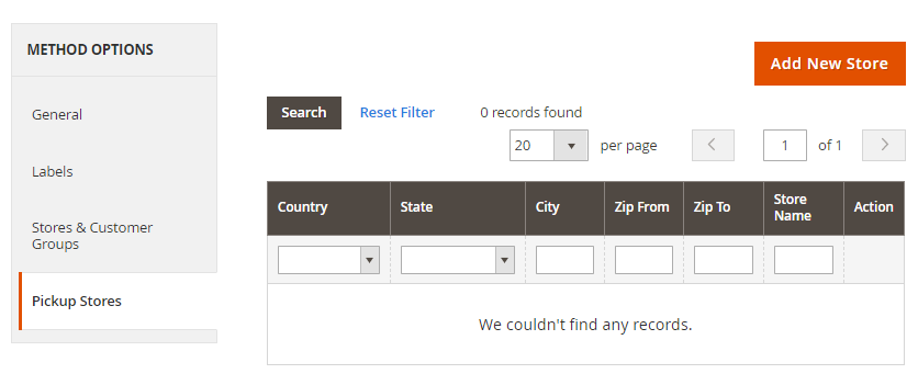 After configuring method settings, we expand the Pickup Stores tab and click the Add New Store button.