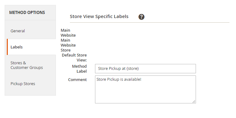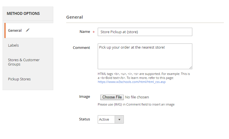 Method Label - fill in a method label. Use {store} variable to automatically generate store title and that will be displayed to a customer. Comment - provide some extra information about store pickup method.