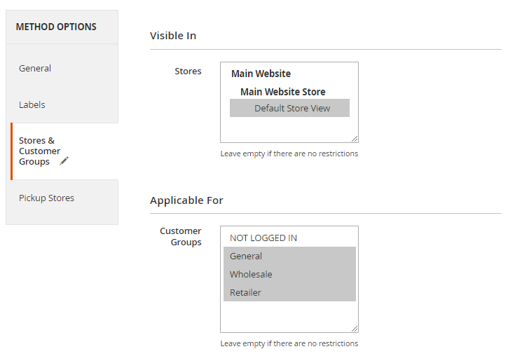 Customer Groups - select customer groups for which store pickup will be allowed. Leave empty if there are no restrictions.