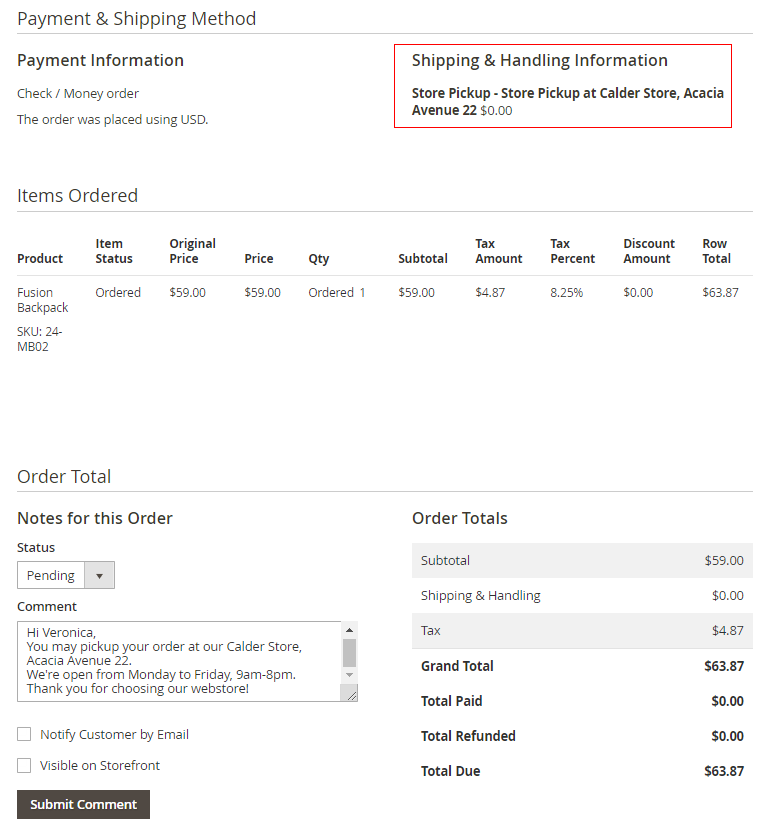 If a customer chooses Store Pickup as a shipping method, you will see it on the Order View page in the Shipping & Handling Information block.