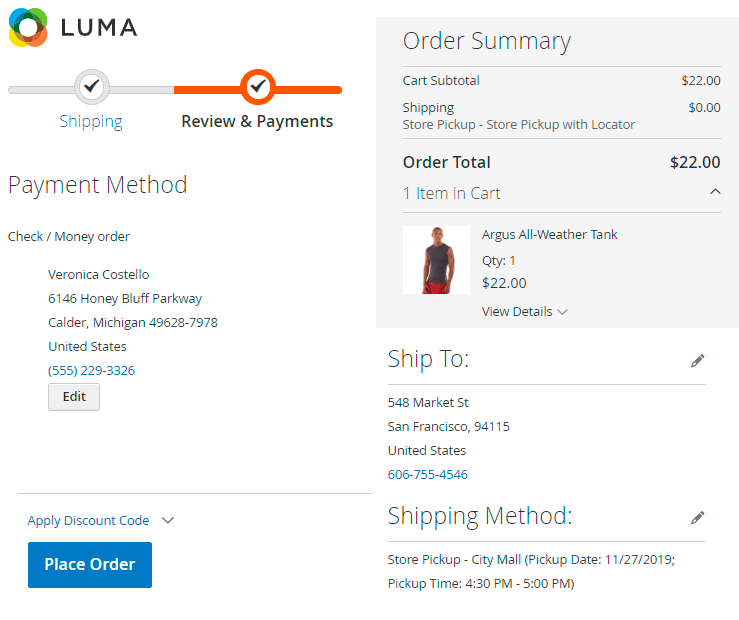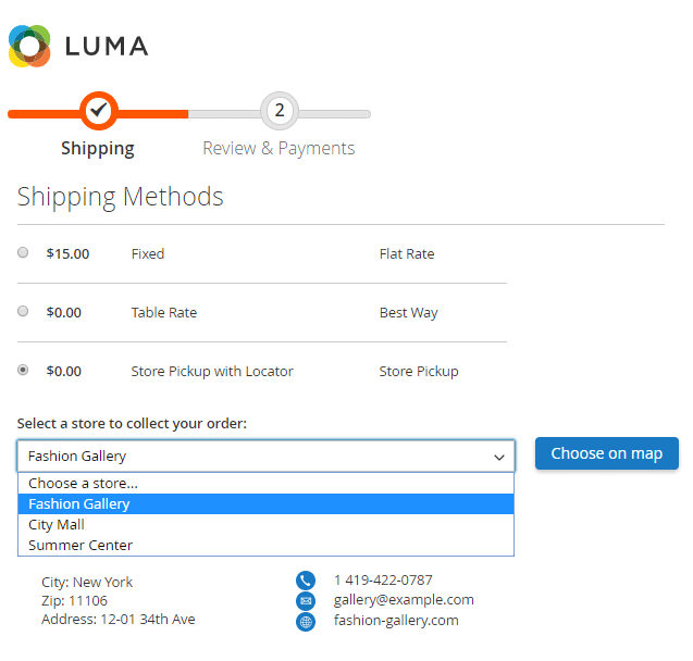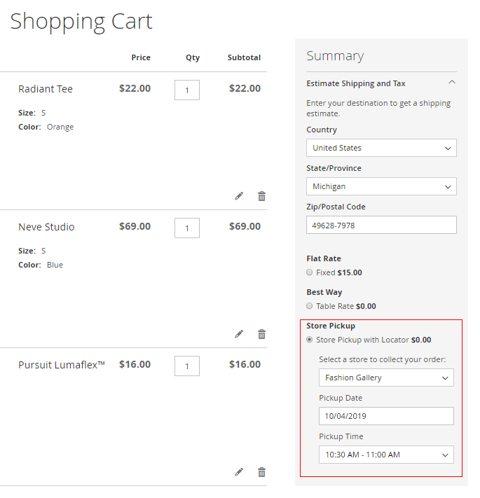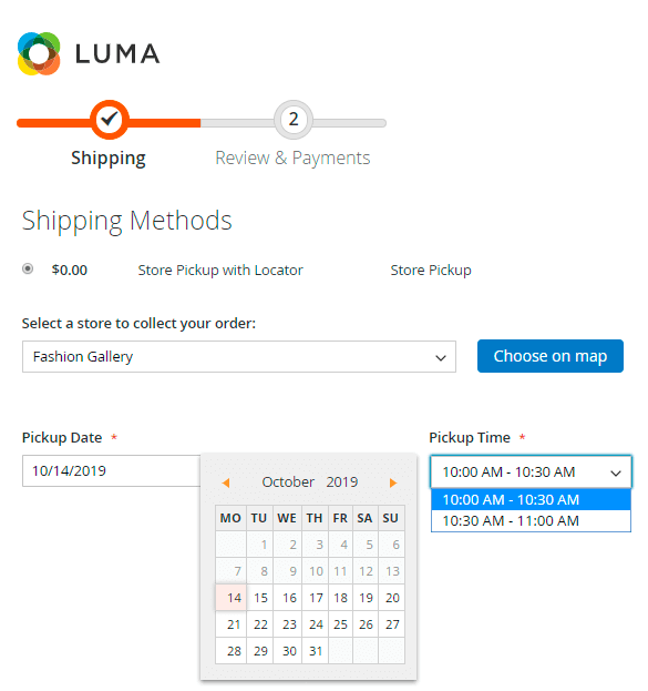 Customers can also choose the Store Pickup method and specify its details right from the shopping cart.