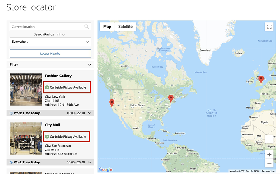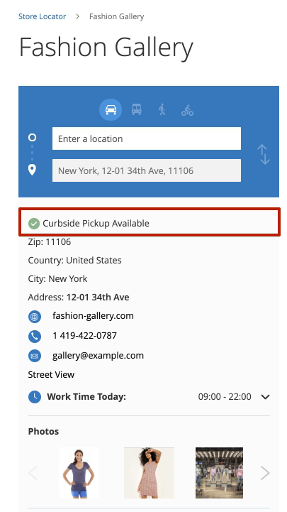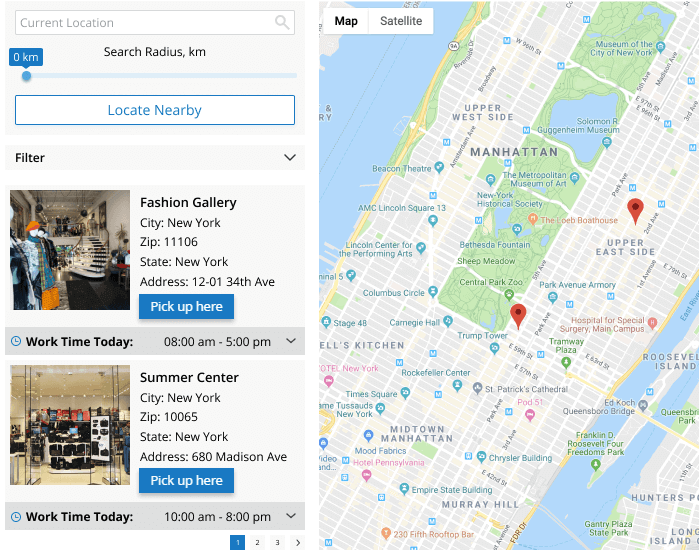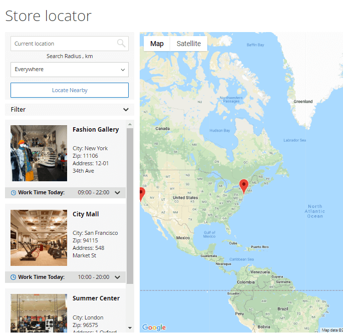 Display all needed store information on a separate location page. Easily customize the page according to your business needs. Add detailed store description and image gallery, list brands and main product categories, specify payment methods and other store attributes.