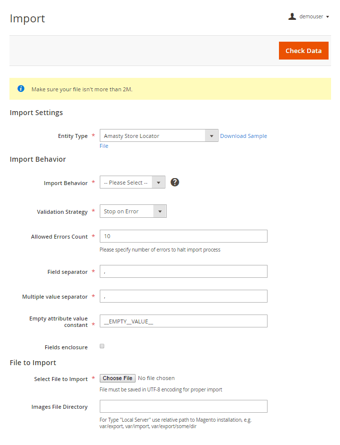Set Entity Type as Amasty Store Locator. Use the Download Sample File link to get the example of the correct .CSV file that can be imported to the Store Locator module.