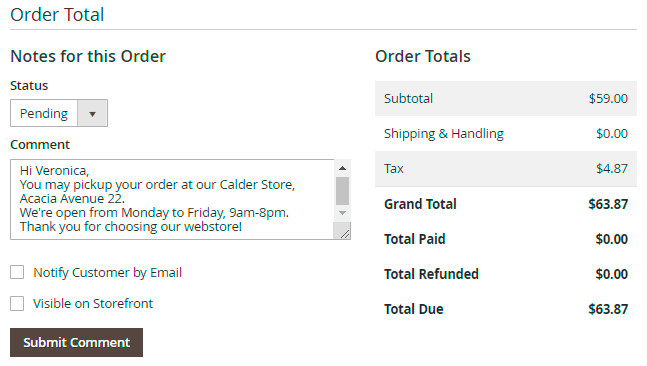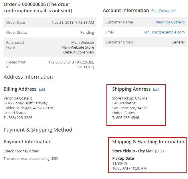 If a customer chooses Store Pickup as a shipping method, you will see it on the Order View page in the Address Information block.