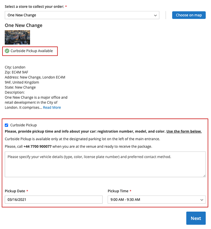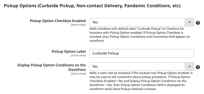 Pickup Option Label - with this field you can customize the name of the pickup option. For example, you may name it 'No-Contact Delivery', 'Curbside Pickup', 'Delivery to my cart', etc.
