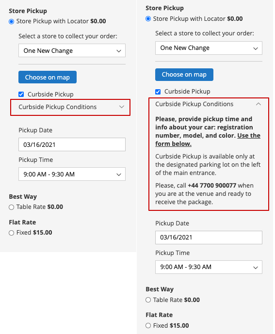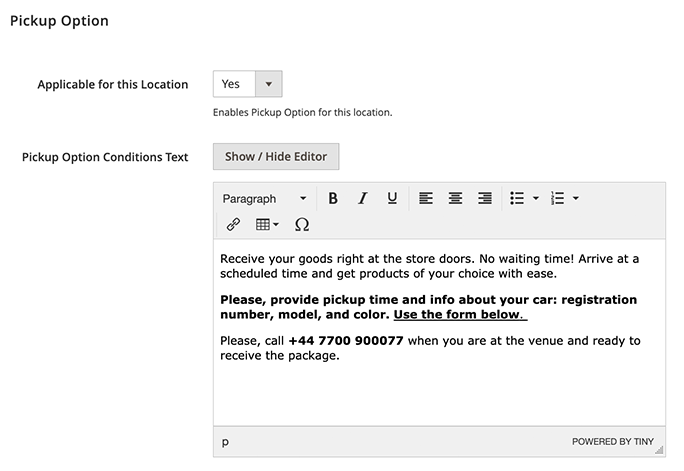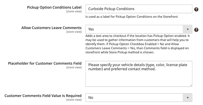 Pickup Option Conditions Label - customize the way Pickup Conditions will be labeled on the frontend. For example, it could be adjusted to Curbside Delivery Terms and Conditions.