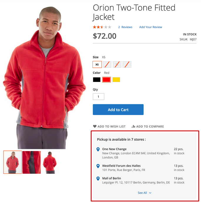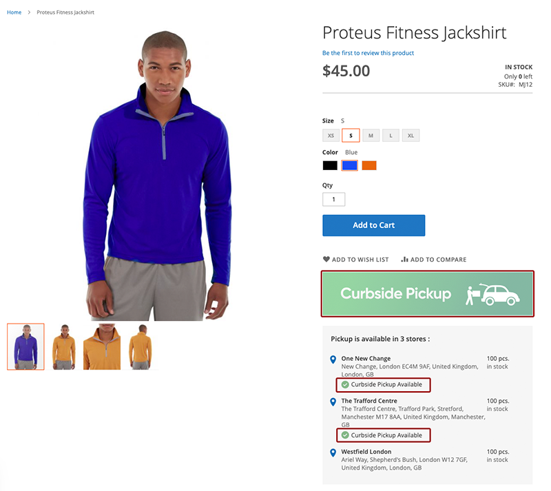 To improve user experience, customize the delivery option name and add a colorful banner to promote it on product pages. There are also labels near store names, to provide users with clear info on which store supports the new pickup option.