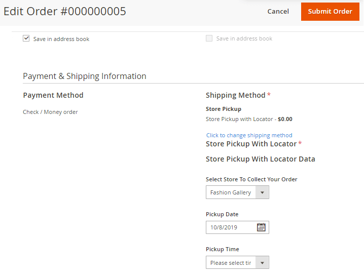 Also, you can edit any order shipping method information from the admin panel or create an order with the store pickup shipping method.