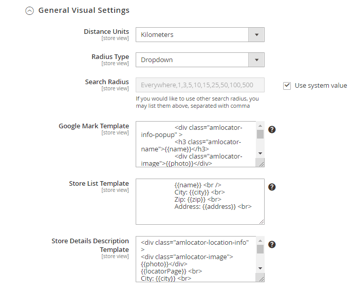 Store List Template — specify the stores' info you want to display in the store list. Add the necessary variables and remove the ones you don't need.