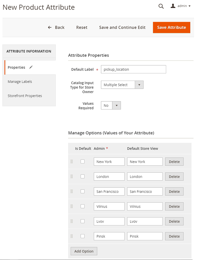 First, kindly go to Stores → Product Attributes and create a product attribute of any suitable type. In the example below, we used a Multiple Select attribute type. For options, you can enter the names of the cities or just store names.