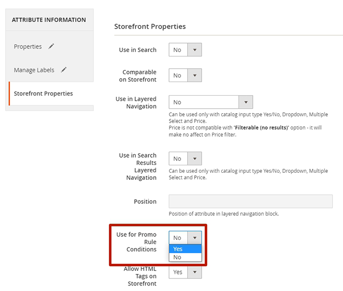 Then, in the Storefront Properties tab set the Use for Promo Rule Conditions to Yes. It's an important step that directly affects whether the Pickup Location attribute will be used for conditions.