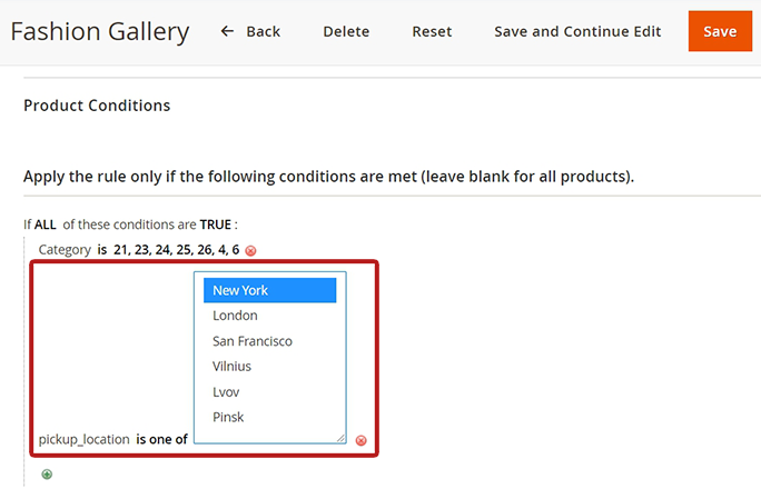 You can skip this tab if you need all products to be available. Alternatively, in case some products are available only in specific offline stores, you can assign them to the necessary store location with the help of conditions.