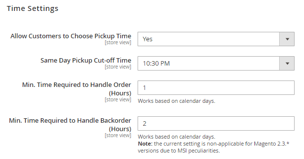 Min. Time Required to Handle Backorder - Specify the time required to handle the backorder. Works based on calendar days. This way you'll set a minimal time period, after which the Pickup Time will be available on the checkout. Applicable for the products with the system attribute 'Out of Stock'