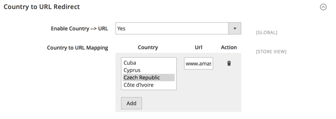 Country to URL Mapping — select locations and specify the URL that would be used to redirect visitors to. Use the Add button to create a new country — URL relation.