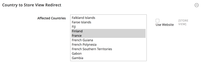 Expand the Country to Store View Redirect section.