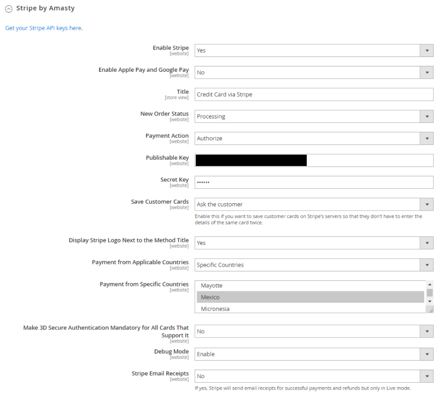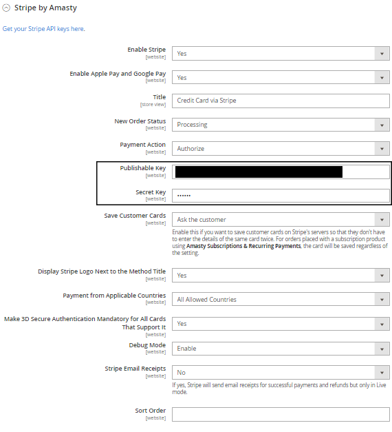 To integrate the merchant's stripe account with a Magento store, please go to Stores → Configuration → Payment methods → Other Payment Methods → Stripe by Amasty.
