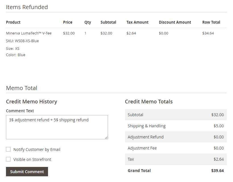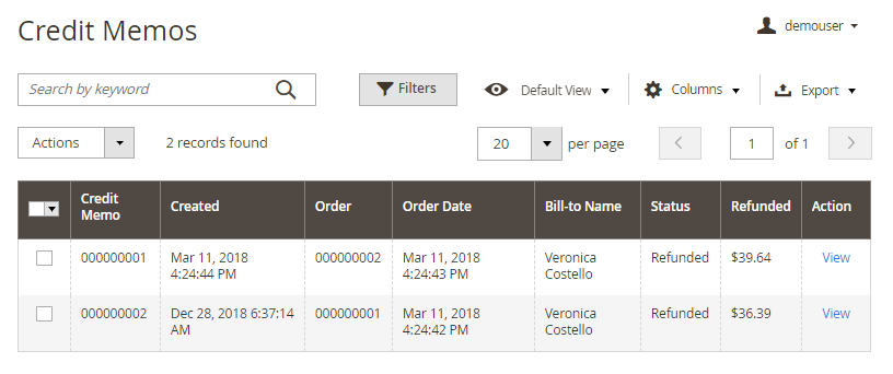 On a handy grid you can see the Credit Memo, dates the refund was Created, the Order and its Date, Bill-to Name, active Status and the Refunded sum.