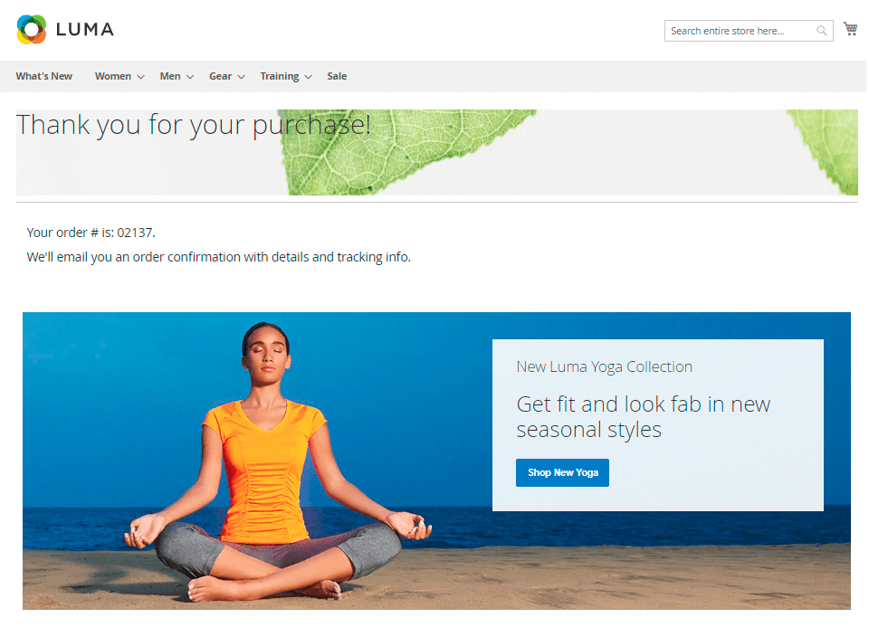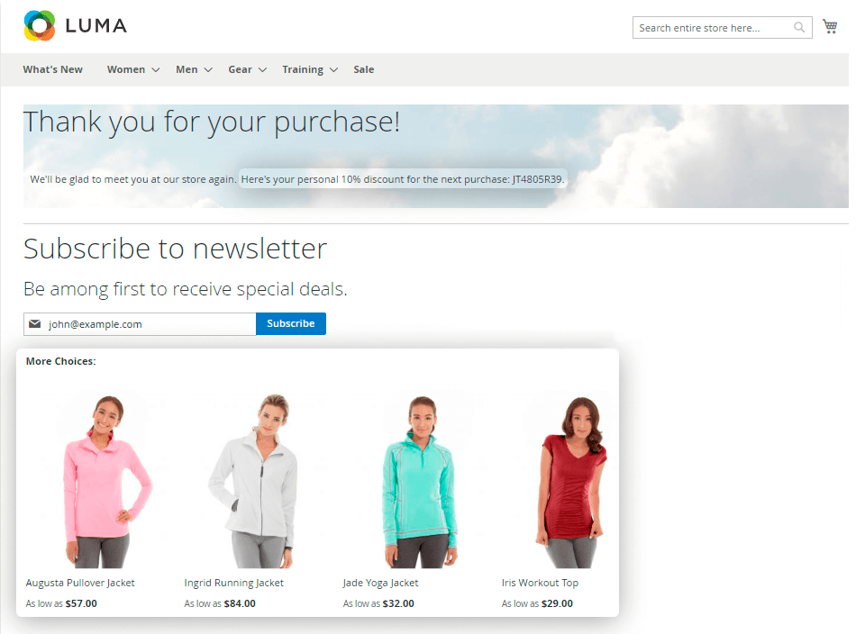 Motivate your customers to return to the store and buy more by offering coupons, subscribing to newsletter and displaying a cross-sell block on a Thank You page.