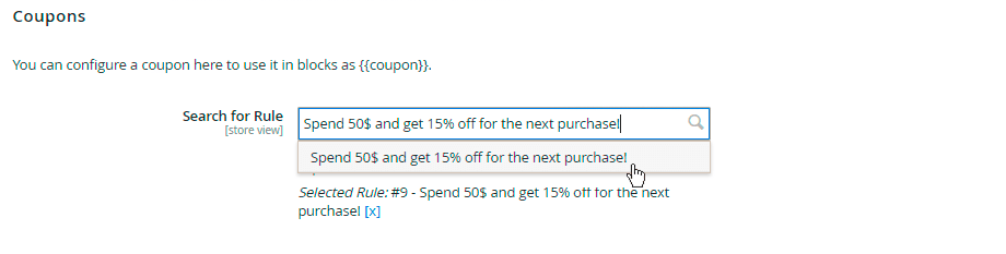 Search for Rule - select a shopping cart rule to add the coupon to.