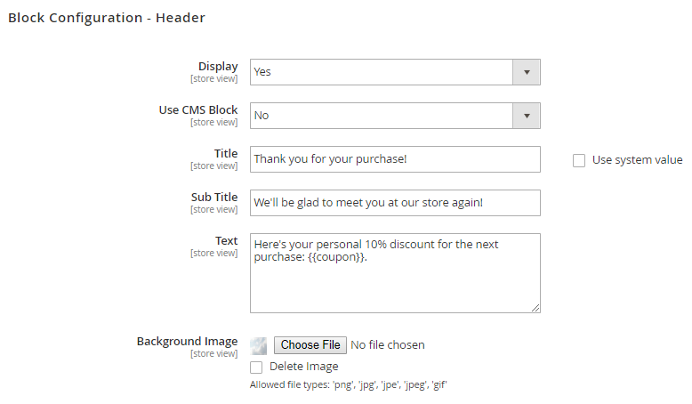 Use CMS Block - if Yes, choose CMS block you want to add to the header. Set to No for custom configuration.